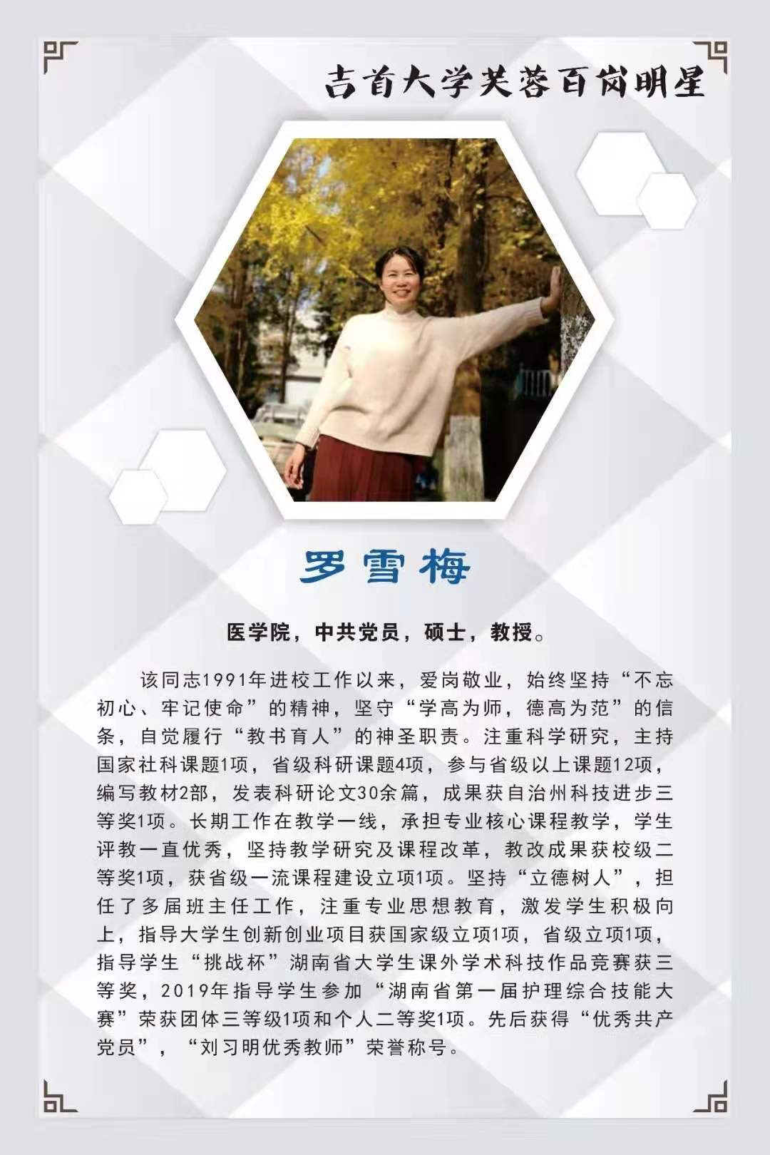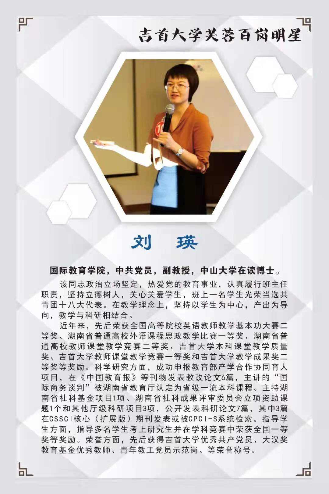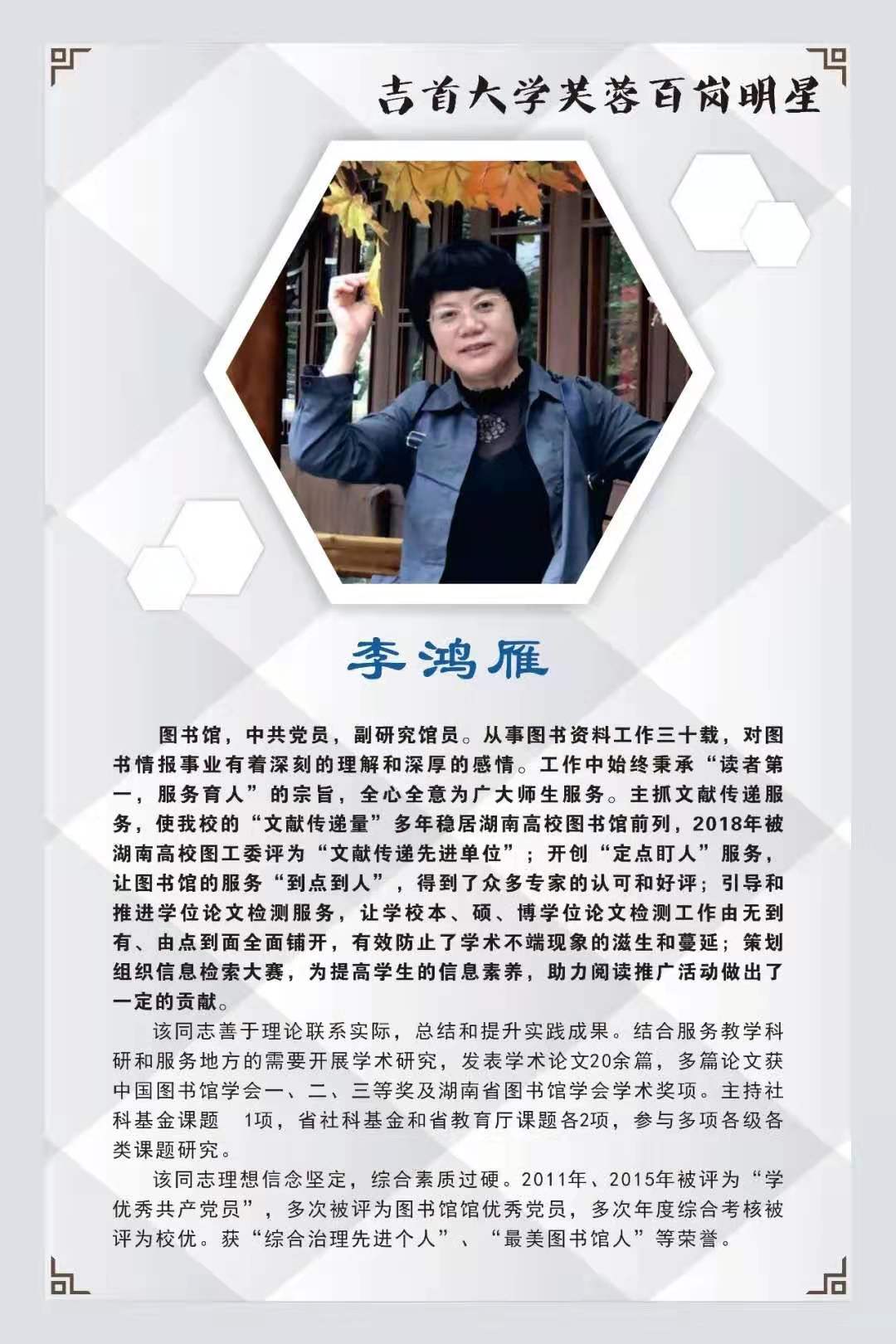 本期我们撷取10名“芙蓉百岗明星”的先进事迹与大家分享,希望受表彰的同志发扬成绩,再接再厉,开拓进取,为学校新发展作出新贡献。希望广大教职工向她们学习,积极投身学校改革和发展事业,为全面提高学校核心竞争力,构建和谐校园作出更大贡献。