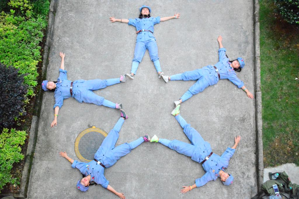 不管是在爱国教育基地,还是在革命遗址,队员们身着红军服,没有去自拍,而是利用人体的艺术美去构造各种星星的图案,“我们还是只是学生,只能以这种简单的方式——用照片致敬我党。”实践队员钟曼这么说道。