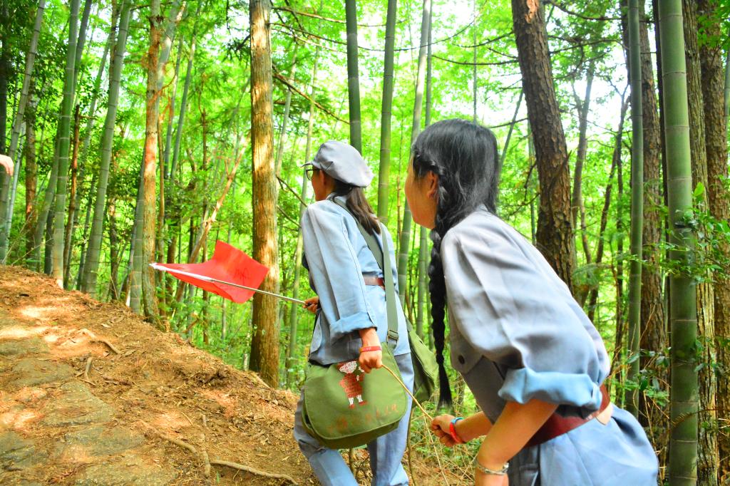 路为羊肠小道,崎岖不平。“小苹果”团队的队员还未走出一百米,已经气喘吁吁、汗流浃背。胡志千是这支队伍的重量与体力担当,但在朱毛红军挑粮小道上,他自己这样说到:“这平常的优势变成弱势了......想当年,朱毛带领红军战士在战争期间穿梭于山上山下,还挑着那么重的粮,都没有叫苦叫累,四处抱怨。何况今天体验的路程只有3100米,爬上山顶却煎熬万分。”豆大的汗珠很快从他的脸颊上流下,身上的红军服装早已湿透。 “为学犹掘井,井愈深土愈难出,若不快心到底,岂得见泉源乎?”吉大“小苹果”实践团队始终坚持“不抛弃、不放弃”,相互搀扶,有说有笑,欢声阵阵。为给自己和队友“打气”,胡志千还起头带动队员在休息之余唱起红歌,嘹亮歌声响彻山涧。最终,吉大“小苹果”青媒中心社会实践团成功走完朱毛挑粮小道。